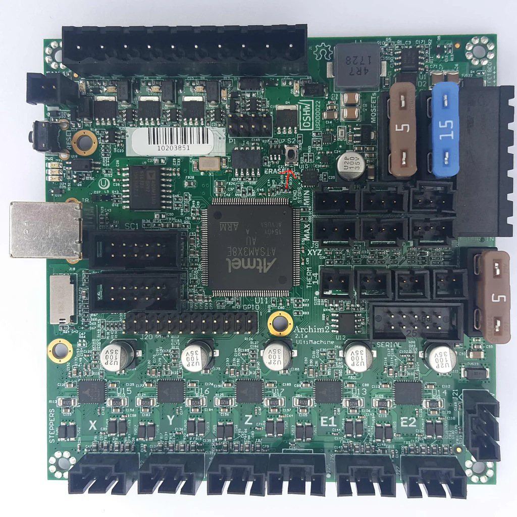 You need to power off the printer, pop open the side panel and then hold down a very small button on the main board labeled “Erase” as you switch the printer on (see red arrow). Release it after switching the printer on. At this point, the printer should show up in Device Manager as a COM port and you should be able to reflash the firmware successfully.